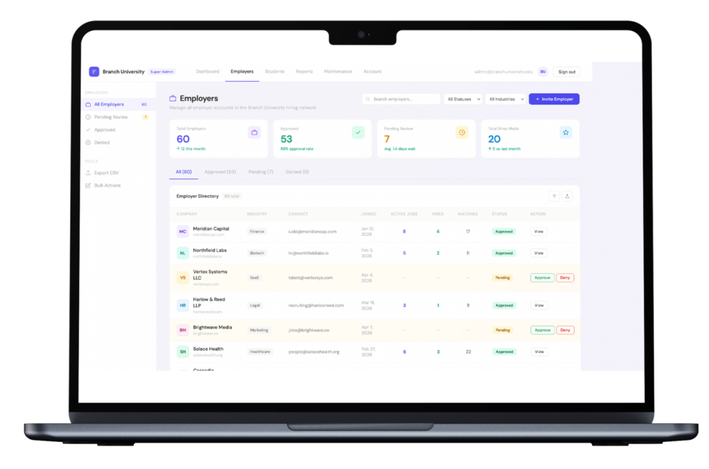 Connect enrolled students with alumni employers and campus recruiting partners. Build a private career network your institution owns.