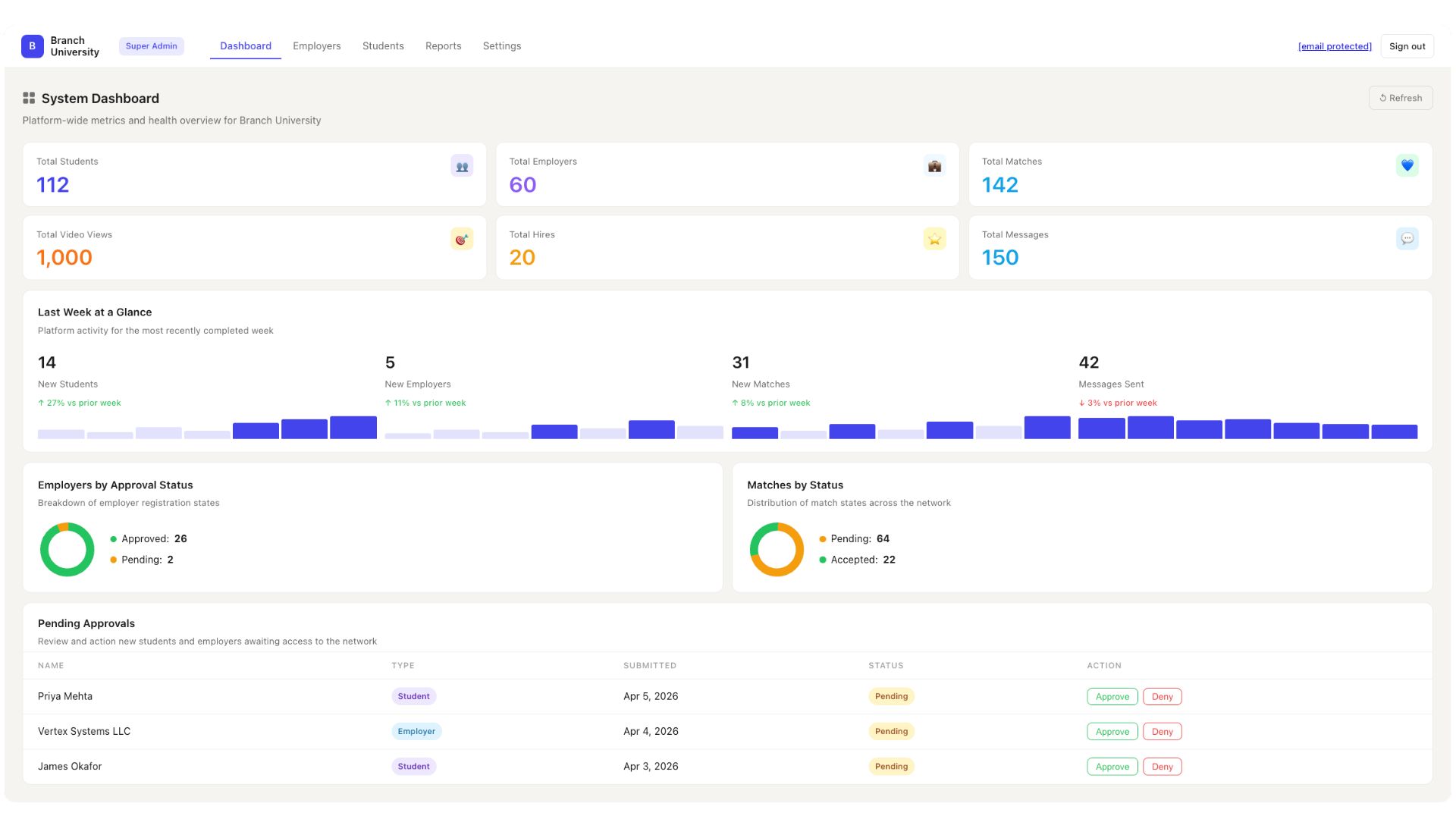 Every partner gets a dedicated super admin dashboard. Below is what Branch University’s admin sees: full control, live data, and complete visibility.